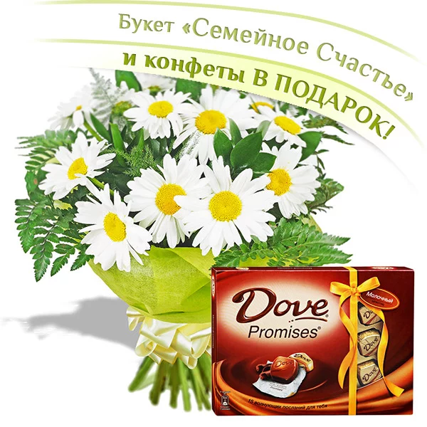 7 ромашек: ромашка белая - 7 шт, салал, триферн - 2, папоротник - 3 шт, фетр зеленый, конфеты "Dove promises".