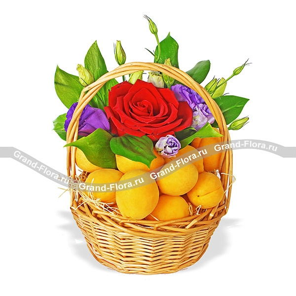 Уменьшенный: (На фото) роза красная - 1 шт., эустома фиолетовая - 1 шт., рускус - 1 шт., оазис, корзина малая, абрикоса - 1 кг.