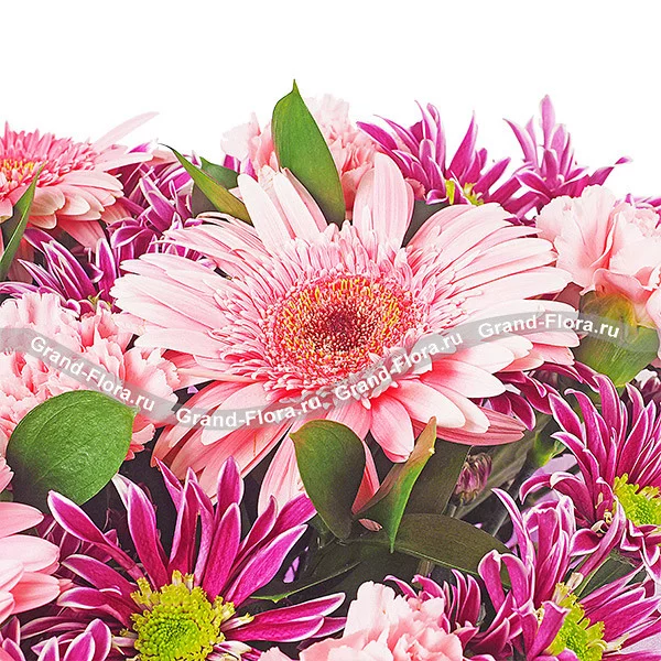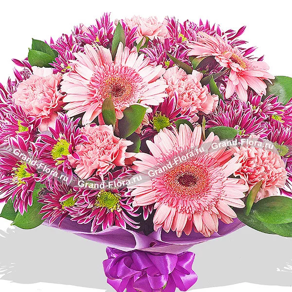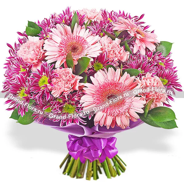 Стандартный: гербера розовая - 3 шт., гвоздика одноголовая розовая - 6 шт., хризантема кустовая фиолетовая - 4 шт., рускус, фетр фиолетовый.