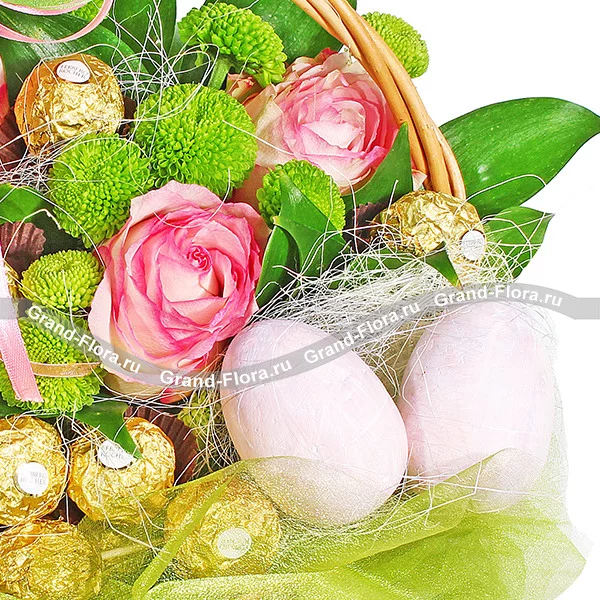 Стандартный: роза розовая - 3 шт., хризантема кустовая зеленая (сантини) - 2 шт., рускус - 2 шт., корзина средняя, фетр зеленый, оазис, яйца (декоративные) - 2 шт., бант розово-зеленый, конфеты "Ferrero Rocher".
