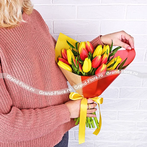 9 тюльпанов: желтые и оранжевые тюльпаны - 9 шт., упаковка, лента.